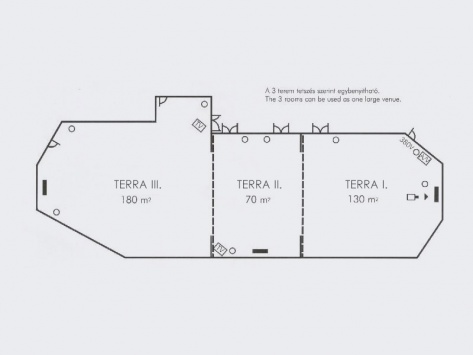 | Terem neve | Terület | Magasság | Termé-szetes fény | Légkondí-cionálás | Sötétítés | Kapacitás Álló fogadás | Kapacitás Színház-terem | Kapacitás Iskolapad | Kapacitás "U" alak | Kapacitás "Cabaret" | Kapacitás Tárgyaló-asztal |